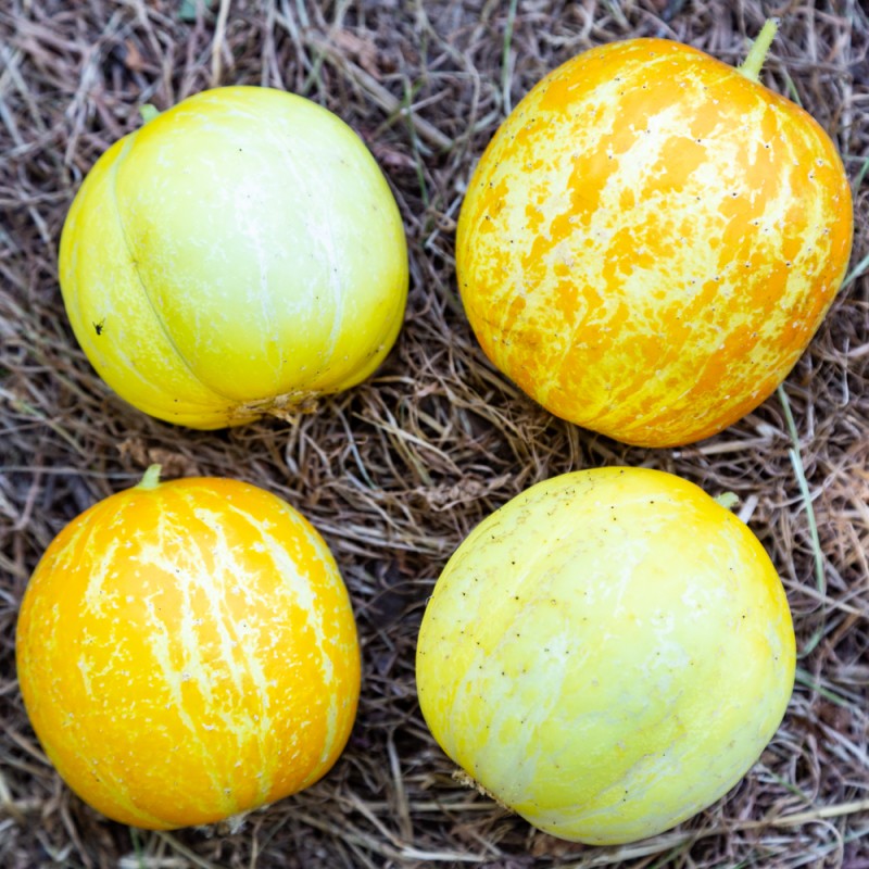 Melon charentais Fruits de 10-12cm de diamètre, peau claire, chair orange vif, très parfumée. Garder 3-4 fruits par plants. 1.50€